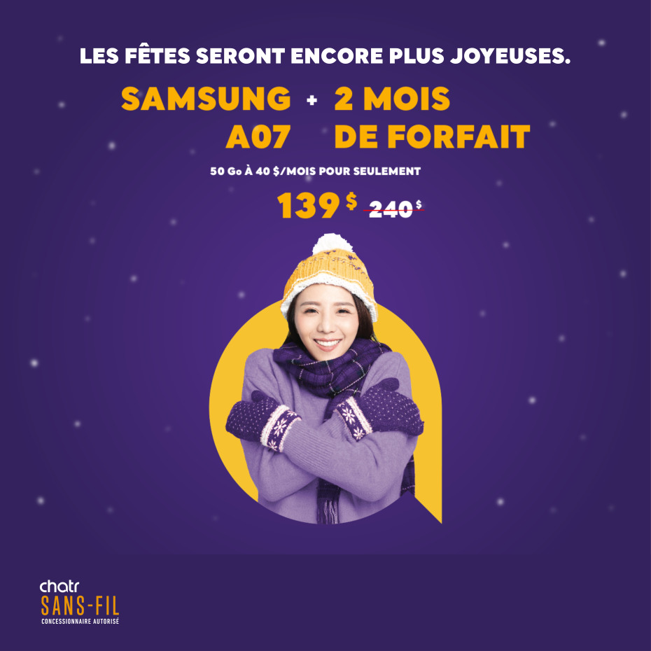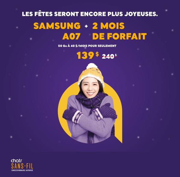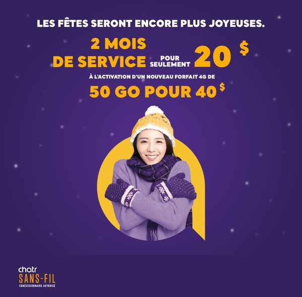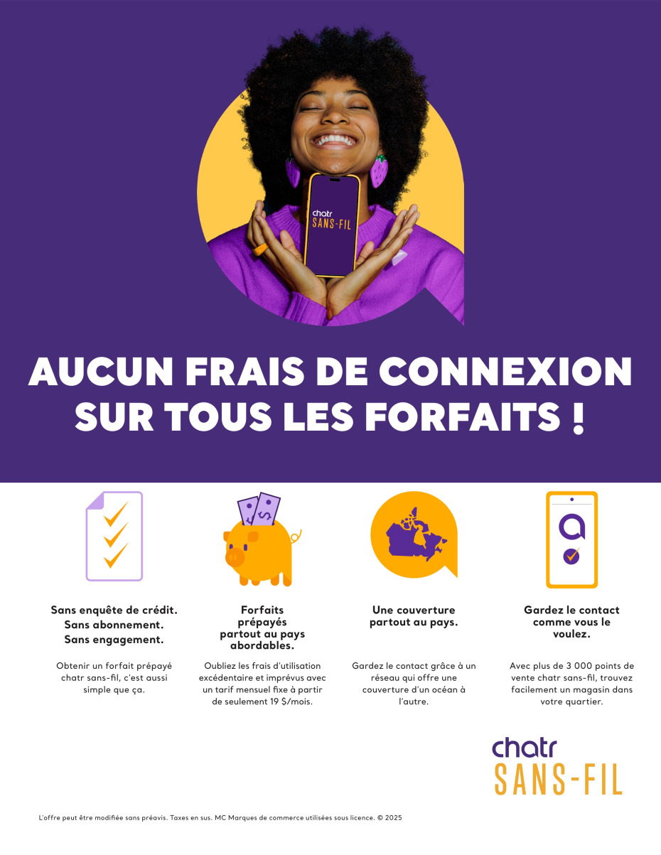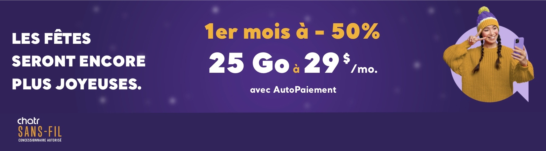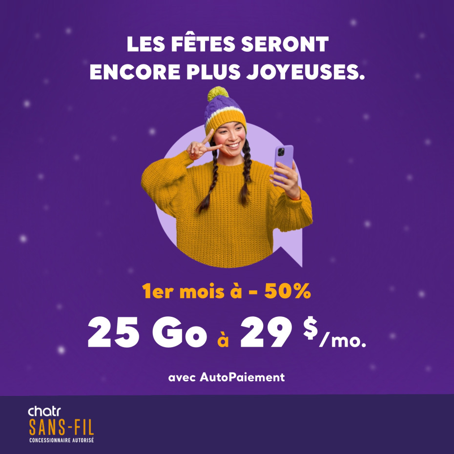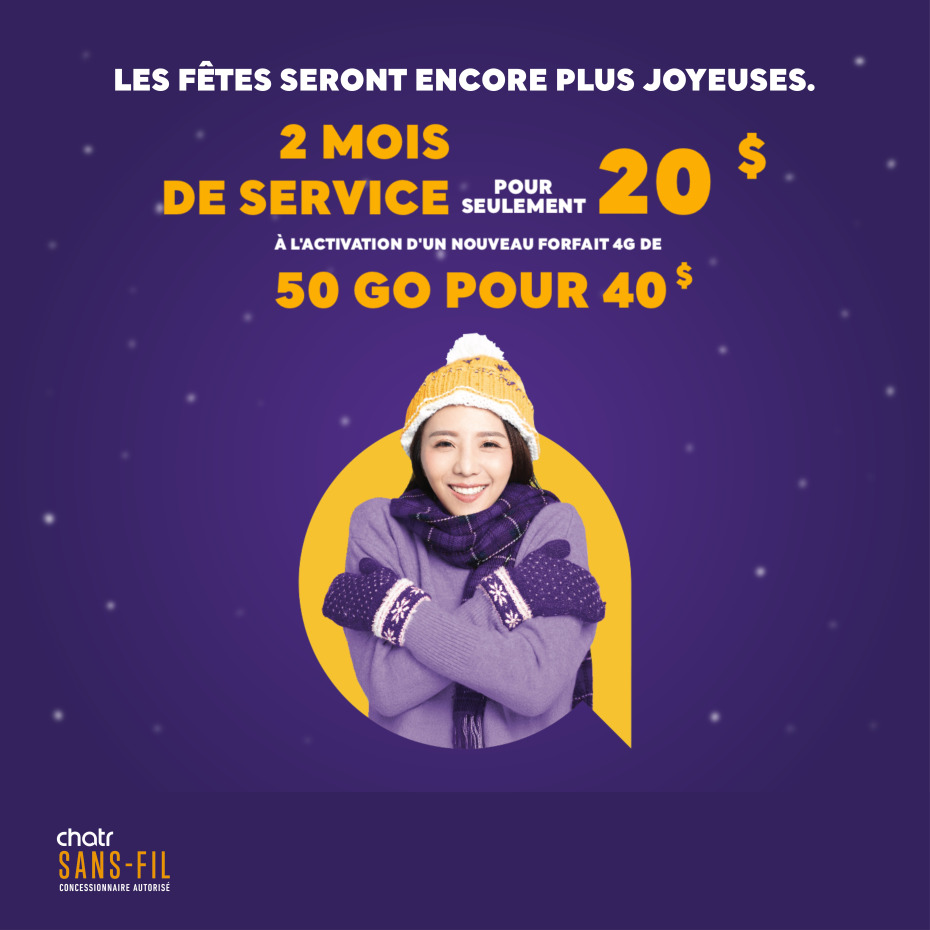 L’offre est sujette à modification sans préavis. Cette offre ne peut être combinée avec d’autres offres. Le bonus de données expirera si le compte devient inactif ou si le forfait est modifié avant la fin de la période promotionnelle.